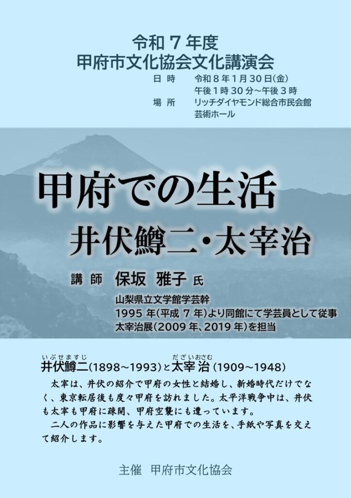甲府市文化協会では、会員はもとより市民の文化意識の高揚を図り、文化芸術への認識を深め、今後の文化活動の一助としていただくため、毎年度、新年の初めに、文化講演会を実施しています。